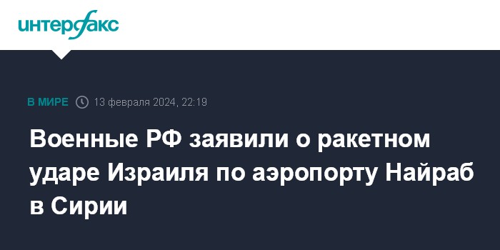 Москва. 13 февраля. INTERFAX.RU - Два истребителя ВВС Израиля нанесли удар крылатыми ракетами по международному аэропорту Найраб в сирийской провинции Алеппо, заявил замруководителя российского Центра по примирению враждующих сторон в САР (ЦПВС) контр-адмирал Вадим Кулить.