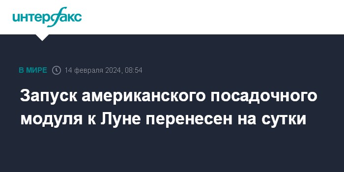 Москва. 14 февраля. INTERFAX.RU - Из-за технической проблемы запуск автоматической межпланетной станции Nova-C техасской компании Intuitive Machines к Луне, планировавшийся в среду, перенесен на сутки, сообщила SpaceX.