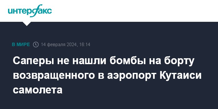 Ранее в среду пресс-служба Кутаисского международного аэропорта сообщила, что рейс Кутаиси - Барселона был вынужден вернуться в Кутаисский международный аэропорт из-за информации о возможном наличии на борту взрывчатого вещества.