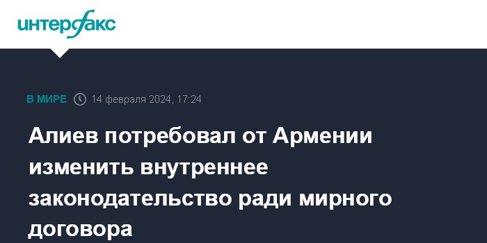 Москва. 14 февраля. INTERFAX.RU - Президент Азербайджана Ильхам Алиев заявил на церемонии инаугурации, что если Армения не изменит внутреннее законодательство, то мирный договор между сторонами не будет подписан.