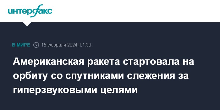 Москва. 15 февраля. INTERFAX.RU - Ракета Falcon 9 в четверг по московскому времени в рамках миссии USSF-124 Космических сил США стартовала на орбиту с группой новых американских спутников отслеживания пусков гиперзвуковых ракет, сообщила компания-разработчик носителя SpaceX.