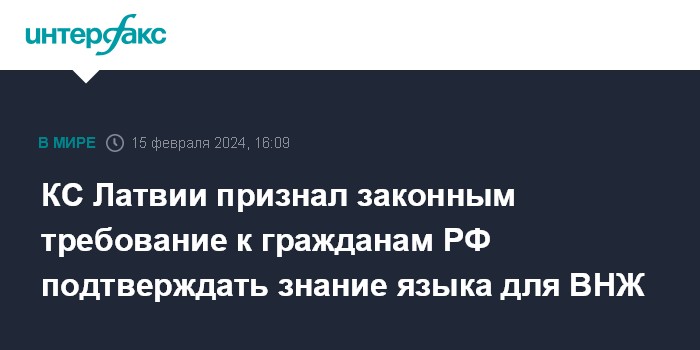 Москва. 15 февраля. INTERFAX.RU - Конституционный суд (КС) Латвии в четверг признал соответствующей основному закону страны норму, обязывающую граждан России подтверждать знание латышского языка для получения нового вида на жительство (ВНЖ), передает агентство BNS.