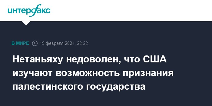 Москва. 15 февраля. INTERFAX.RU - Премьер Израиля Биньямин Нетаньяху обеспокоен тем фактом, что в Вашингтоне обсуждают возможность признания палестинского государства, сообщает в четверг Axios со ссылкой на двух неназванных представителей израильских властей.