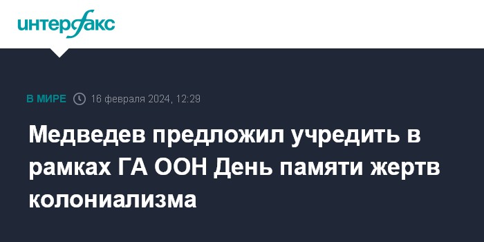 Москва. 16 февраля. INTERFAX.RU - Председатель "Единой России" Дмитрий Медведев предложил рассмотреть на Генеральной ассамблее ООН вопрос об учреждении Дня памяти жертв колониализма.