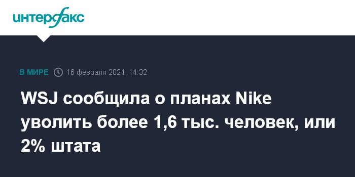 Москва. 16 февраля. INTERFAX.RU - Американский производитель спортивных товаров Nike Inc. уволит более 1,6 тыс. человек, или около 2% штата. Об этом пишет The Wall Street Journal со ссылкой на его сообщение сотрудникам.