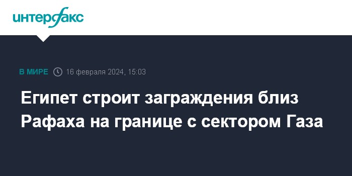 Москва. 16 февраля. INTERFAX.RU - Египет возводит заграждения на своих территориях близ приграничного города Рафах в секторе Газа, где в данный момент сосредоточено более миллиона мирных жителей анклава. Об этом сообщает агентство Associated Press (AP) со ссылкой на данные спутников.