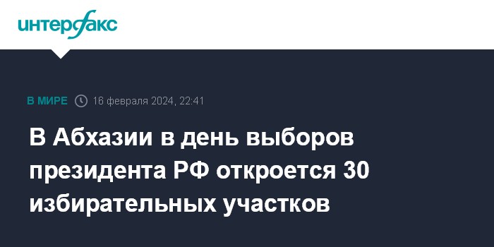 Москва. 16 февраля. INTERFAX.RU - В день выборов президента России на территории Абхазии откроется 30 избирательных участков, сообщил вице-президент республики Бадра Гунба на совещании в администрации президента республики.
