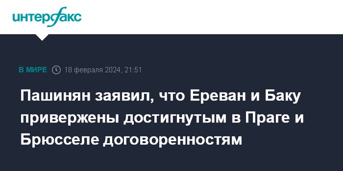 Москва. 18 февраля. INTERFAX.RU - Премьер-министр Армении Никол Пашинян заявил, что на встрече с президентом Азербайджана Ильхамом Алиевым в Брюсселе подтверждена приверженность договоренностям, достигнутым ранее в Праге и столице ЕС.