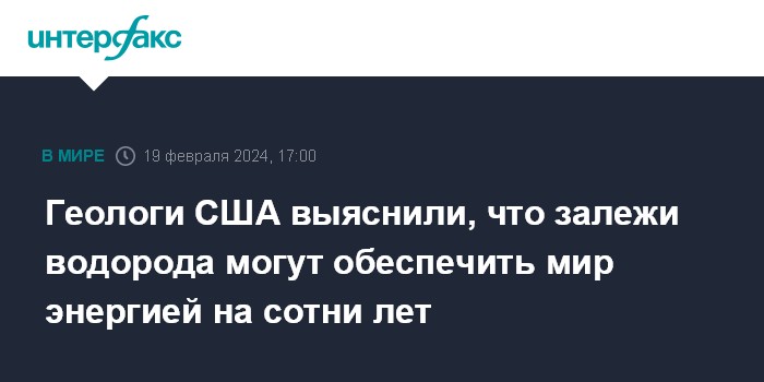Москва. 19 февраля. INTERFAX.RU - Залежи водорода могут обеспечить мир энергией на сотни лет, согласно данным Геологической службы США (U.S. Geological Survey).