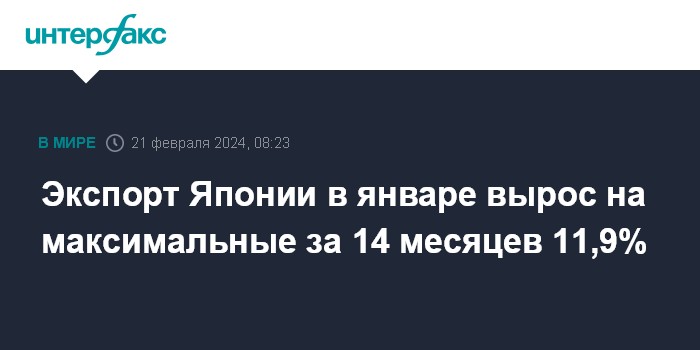 Москва. 21 февраля. INTERFAX.RU - Объем экспорта Японии в январе увеличился на максимальные за 14 месяцев 11,9% относительно того же месяца предыдущего года - до 7,333 трлн иен ($48,88 млрд), говорится в отчете министерства финансов страны.
