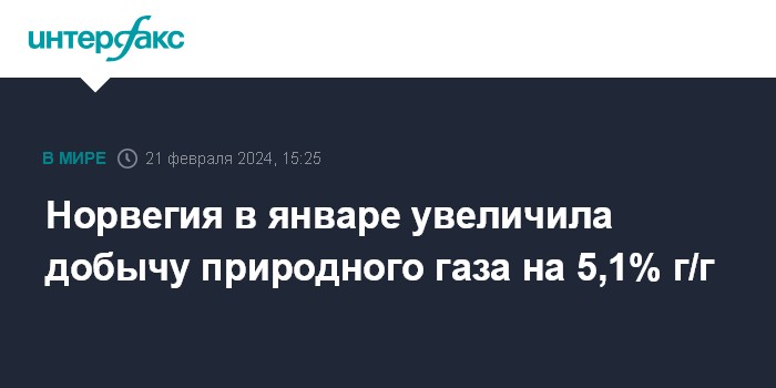Москва. 21 февраля. INTERFAX.RU - Добыча природного газа в Норвегии в январе составила 11,71 млрд кубометров, что на 5,1% больше показателя за тот же месяц прошлого года, по предварительным данным Норвежского офшорного директората (NOD).