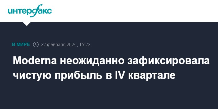 Москва. 22 февраля. INTERFAX.RU - Американская биотехнологическая компания Moderna Inc. неожиданно зафиксировала чистую прибыль в четвертом квартале 2023 года, хотя этот показатель был почти в 7 раз меньше, чем годом ранее, из-за сокращения продаж вакцин от COVID-19.