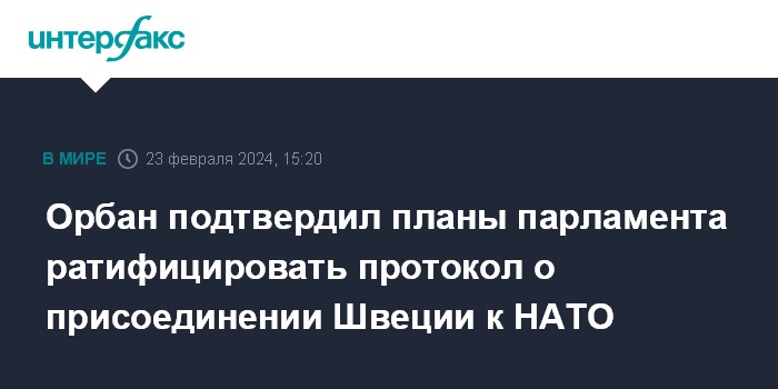 Москва. 23 февраля. INTERFAX.RU - Глава правительства Венгрии Виктор Орбан заверил шведского коллегу Ульфа Кристерссона в том, что венгерские парламентарии утвердят протокол о вступлении Швеции в НАТО.