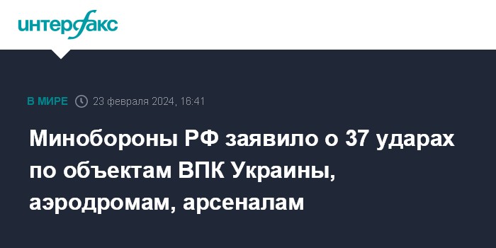 Минобороны РФ заявило о 37 ударах по объектам ВПК Украины, аэродромам, арсеналам