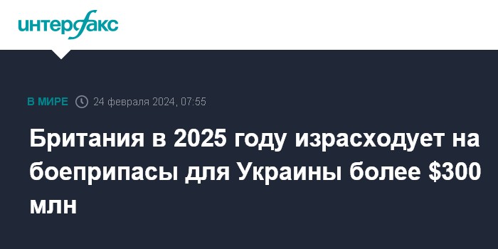 Москва. 24 февраля. INTERFAX.RU - Великобритания планирует в 2025 году потратить 245 млн фунтов стерлингов ($311 млн) на закупку и активизацию цепочек поставок для производства артиллерийских боеприпасов для увеличения запасов Украины, сообщил офис британского правительства.