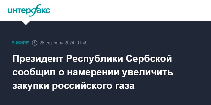 Президент Республики Сербской сообщил о намерении увеличить закупки российского газа
