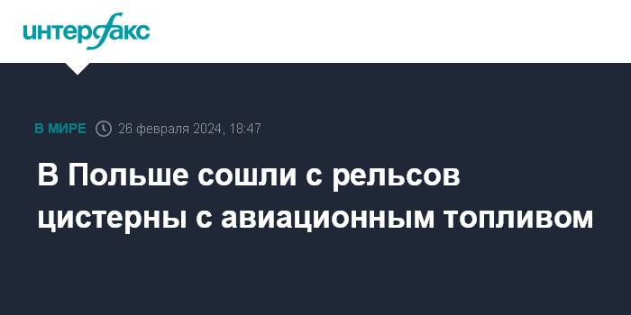 Москва. 26 февраля. INTERFAX.RU - Три цистерны с авиационным топливом в понедельник сошли с рельсов в Нижней Силезии, сообщает Польское телевидение.