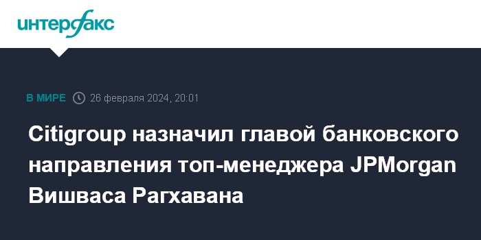 Москва. 26 февраля. INTERFAX.RU - Citigroup Inc. назначил главой банковского направления топ-менеджера JPMorgan Chase & Co. Вишваса Рагхавана.
