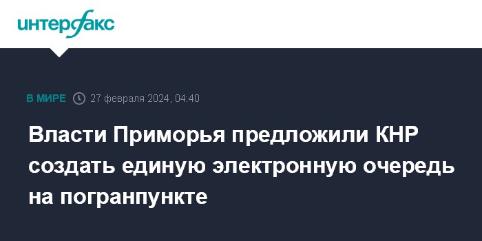 Москва. 27 февраля. INTERFAX.RU - Единую международную систему электронной очереди на пункте пропуска Пограничный-Суйфэньхэ через границу РФ и КНР предлагают создать представители Корпорации развития Приморского края (КРПК), сообщила пресс-служба правительства региона.