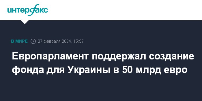 Москва. 27 февраля. INTERFAX.RU - Европейский парламент поддержал создание Украинского фонда в размере 50 млрд евро на период 2024-2027 годов. Его средства будут направлены на поддержку Украины и проведение реформ для присоединения страны в будущем к Европейскому союзу.
