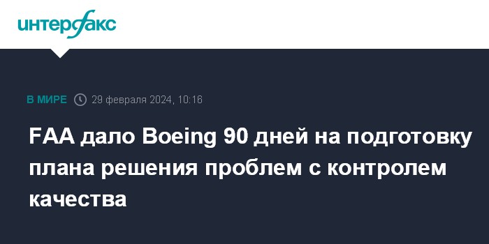 Москва. 29 февраля. INTERFAX.RU - Федеральное управление гражданской авиации США (Federal Aviation Administration, FAA) потребовало от Boeing Co. за 90 дней подготовить комплексный план действий для решения системных проблем с контролем качества. Об этом сообщила пресс-служба FAA.