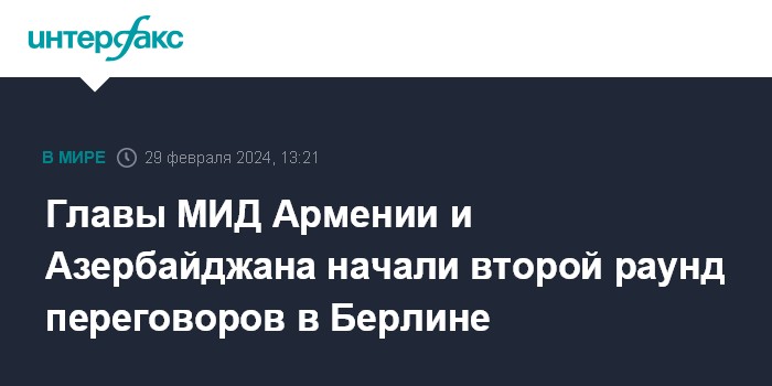 Москва. 29 февраля. INTERFAX.RU - В Берлине в четверг начался второй раунд переговоров глав МИД Армении и Азербайджана Арарата Мирзояна и Джейхуна Байрамова.