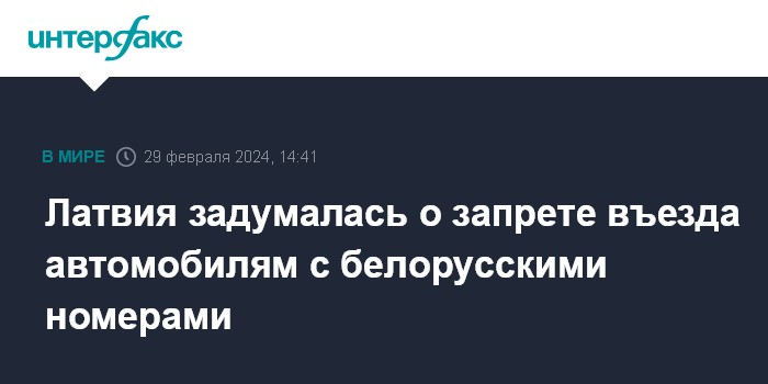 Москва. 29 февраля. INTERFAX.RU - Комиссии парламента Латвии рассмотрят проект поправок к закону о дорожном движении, которые предусматривают запрет на нахождение в Латвии транспортных средств, зарегистрированных в Белоруссии, сообщает BNS.