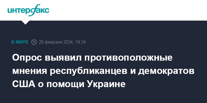 Москва. 29 февраля. INTERFAX.RU - Вопрос об уровне поддержки Украины со стороны США разделил американских граждан в зависимости от партийных предпочтений, свидетельствуют данные опроса, проведенного компанией NORC Center for Public Affairs Research по заказу Associated Press.