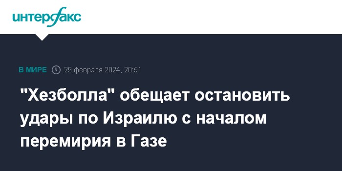 Москва. 29 февраля. INTERFAX.RU - Ливанское движение "Хезболла" готово прекратить атаки против Израиля в случае, если в секторе Газа установят режим прекращения огня, сообщил высокопоставленный представитель движения Хасан Фадлалла.