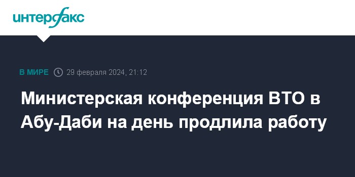 Москва. 29 февраля. INTERFAX.RU - Министерская конференция Всемирной торговой организации, проходящая с 26 февраля в Абу-Даби, как минимум на один день - до пятницы - продлила свою работу.