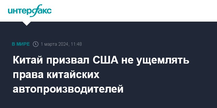 Москва. 1 марта. INTERFAX.RU - Китайский МИД призвал Вашингтон уважать принципы честной конкуренции и не ущемлять китайские компании на фоне планов США провести проверку китайских автомобилей на предмет угрозы национальной безопасности, пишет Global Times.