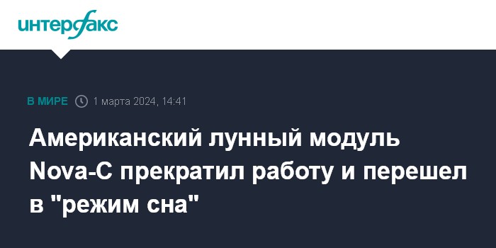 Москва. 1 марта. INTERFAX.RU - В связи с израсходованием заряда электроэнергии и наступлением лунной ночи американский модуль Nova-C ("Одиссей"), совершивший на прошлой неделе посадку на поверхность естественного спутника Земли, прекратил работу, перейдя в "режим сна". Об этом сообщила компания-разработчик аппарата Intuitive Machines.