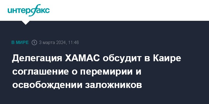 Москва. 3 марта. INTERFAX.RU - Делегация от движения ХАМАС прибыла в Каир на переговоры о соглашении по временному перемирию в секторе Газа и об освобождении заложников, захваченных в Израиле при нападении 7 октября 2023 года, сообщают в воскресенье ближневосточные СМИ.