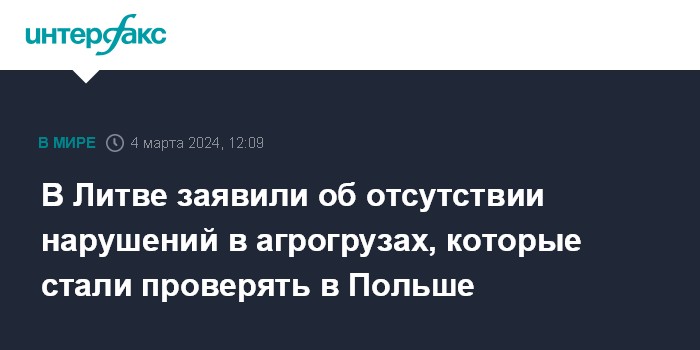 Москва. 4 марта. INTERFAX.RU - Проверки сельскохозяйственных грузов, следующих из Литвы в Польшу, на предмет их возможного украинского происхождения, на данный момент не выявили нарушений, заявил национальной литовской телерадиовещательной компании руководитель литовского Национального центра управления кризисами Вильмантас Виткаускас.