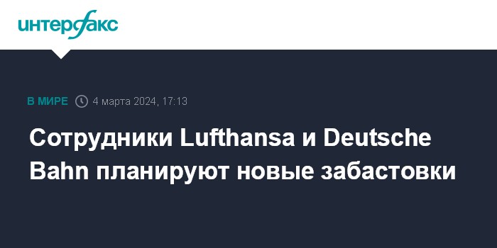Москва. 4 марта. INTERFAX.RU - Сотрудники германской авиакомпании Deutsche Lufthansa и железнодорожного оператора Deutsche Bahn собираются провести новые забастовки на этой неделе на фоне отсутствия прогресса в переговорах с компаниями о повышении зарплат.