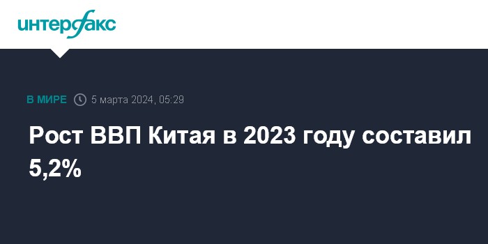 Москва. 5 марта. INTERFAX.RU - В 2023 году ВВП Китая увеличился на 5,2%, заняв одно из первых мест - по темпам роста - среди крупнейших экономик мира, заявил премьер Госсовета КНР Ли Цян.