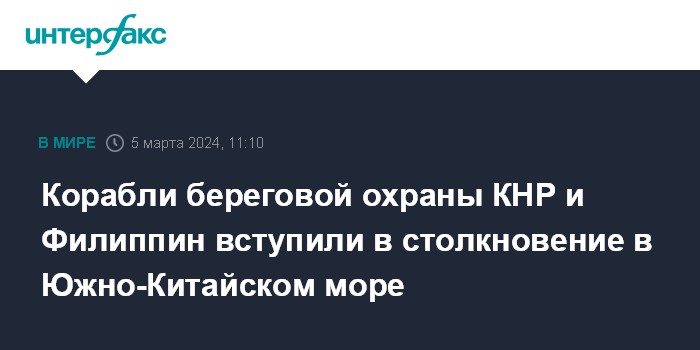 Москва. 5 марта. INTERFAX.RU - Служащие береговой охраны КНР и Филиппин вступили в конфронтацию в спорной части Южно-Китайского моря, в результате чего произошло столкновение китайского и филиппинского кораблей, сообщает Associated Press.