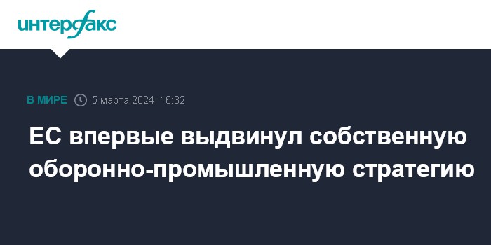 Москва. 5 марта. INTERFAX.RU - Еврокомиссия (ЕК) и глава дипломатии ЕС Жозеп Боррель представили во вторник первую в истории оборонно-промышленную стратегию на уровне Евросоюза и предложили меры по укреплению европейской оборонной промышленности.