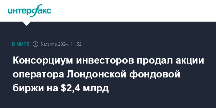 Москва. 6 марта. INTERFAX.RU - Группа инвесторов с участием Blackstone и Thomson Reuters продала акции London Stock Exchange Group Plc (LSEG), оператора Лондонской фондовой биржи (LSE), примерно на 1,9 млрд фунтов стерлингов ($2,4 млрд).