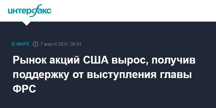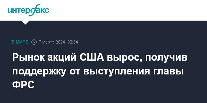 Москва. 7 марта. INTERFAX.RU - Американские фондовые индексы в среду выросли под влиянием выступления главы Федеральной резервной системы Джерома Пауэлла в Конгрессе.