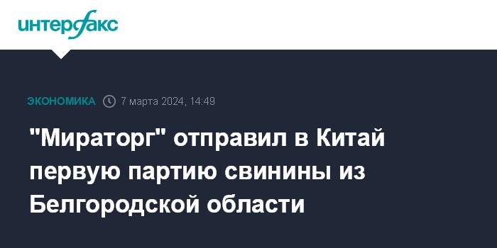 Это первая партия российской свинины, отправленная на китайский рынок после того, как в сентябре 2023 года Китай отменил ограничения на экспорт свинины из РФ.