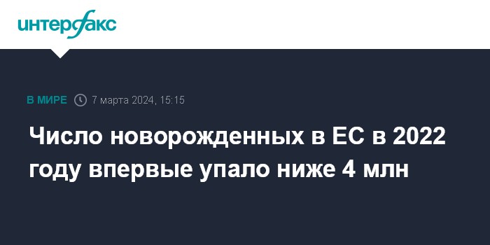 Москва. 7 марта. INTERFAX.RU - Число детей, рожденных в странах Евросоюза, в 2022 году впервые оказалось ниже 4 млн, согласно опубликованным в четверг данным Статистического управления ЕС (Евростат).