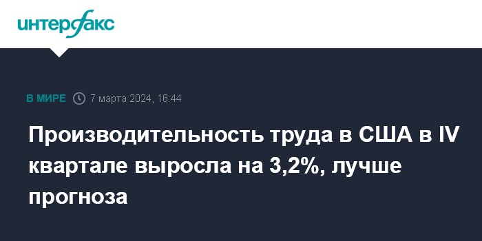 Москва. 7 марта. INTERFAX.RU - Производительность труда в США в четвертом квартале 2023 года выросла на 3,2% в поквартальном выражении, говорится в окончательных данных министерства труда страны.