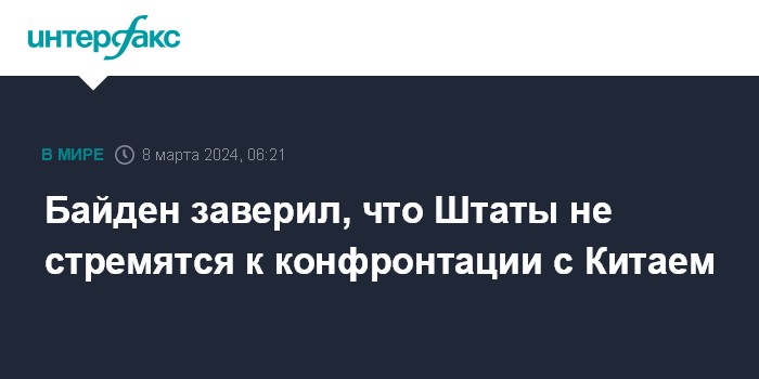 Москва. 8 марта. INTERFAX.RU - Президент США Джо Байден, выступая в Конгрессе с посланием "О положении к стране" заявил, что готов конкурировать с Китаем, но стремится избежать конфронтации.