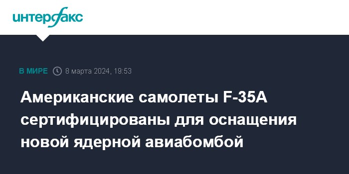 Москва. 8 марта. INTERFAX.RU - Истребители-бомбардировщики пятого поколения F-35A Lightning прошли сертификацию для оснащения новой ядерной авиабомбой B61-12, сообщило издание Breaking Defense, ссылаясь на представителя Пентагона.