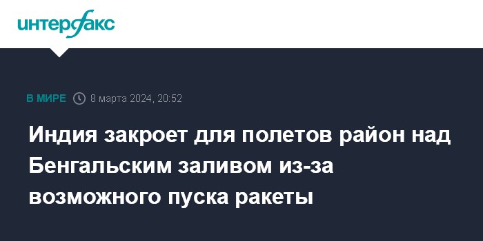 Москва. 8 марта. INTERFAX.RU - Индия закрывает 13 марта для полетов большой воздушный район над Бенгальским заливом, следует из международного предупреждения для пилотов (NOTAM).