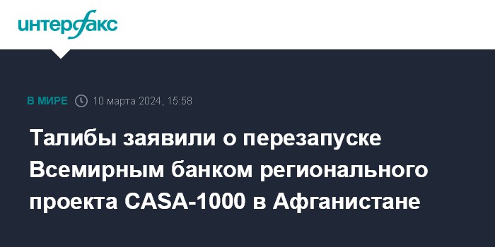 Москва. 10 марта. INTERFAX.RU - Контролирующее Афганистан движение "Талибан" (запрещено в РФ) объявило о возобновлении поддержки Всемирным банком регионального проекта CASA-1000 на территории Афганистана.