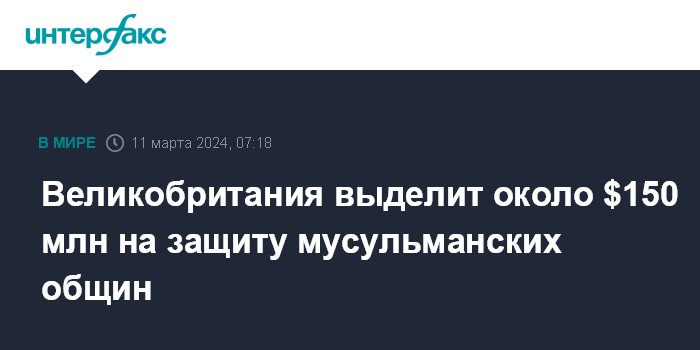 Москва. 11 марта. INTERFAX.RU - Правительство Великобритании выделит 117 млн фунтов стерлингов (примерно $150 млн) на защиту мусульманских общин на фоне роста исламофобии в стране, сообщают английские СМИ.