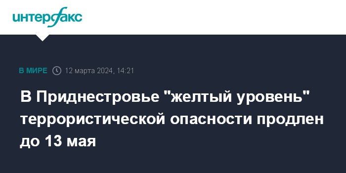 Москва. 12 марта. INTERFAX.RU - Президент непризнанного Приднестровья Вадим Красносельский своим указом продлил высокий "желтый" уровень террористической опасности в регионе на 60 дней - до 13 мая 2024 года, сообщила его пресс-служба.