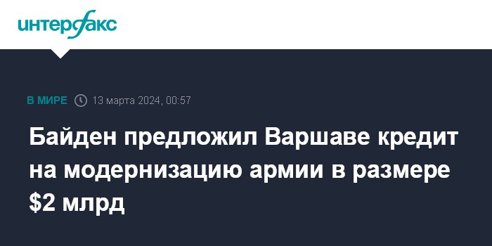 Москва. 13 марта. INTERFAX.RU - Президент США Джо Байден во вторник на встрече с польским коллегой Анджеем Дудой и главой правительства Польши Дональдом Туском предложил Варшаве кредит на сумму $2 млрд, эти средства могут пойти на закупку вертолетов Apache.